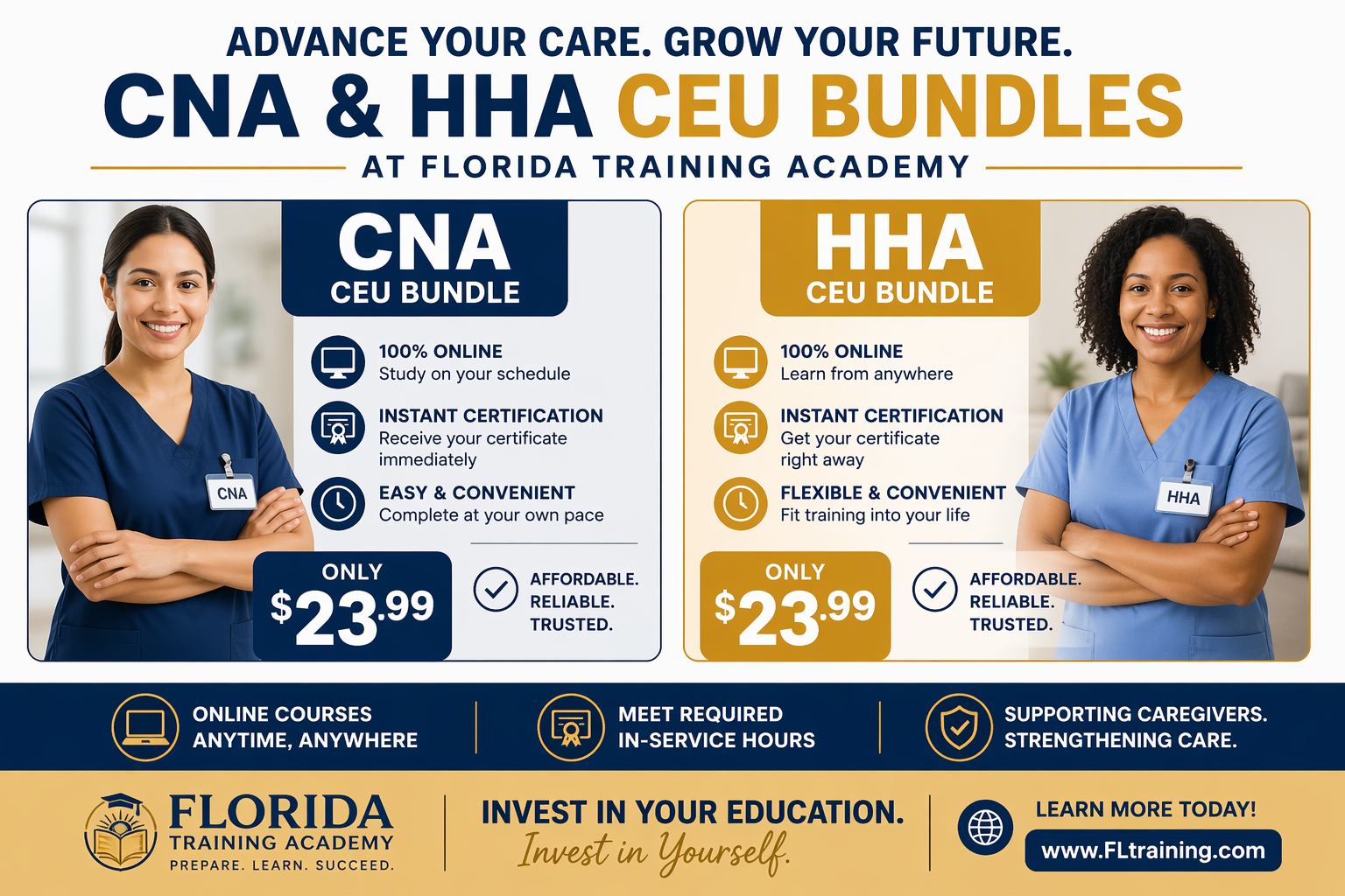 Florida Training Academy is proud to partner with CaresLink to offer convenient online in-service and CEU bundles for Certified Nursing Assistants and Home Health Aides. These courses are designed to help caregivers meet training requirements, stay current, and continue providing safe, quality care.